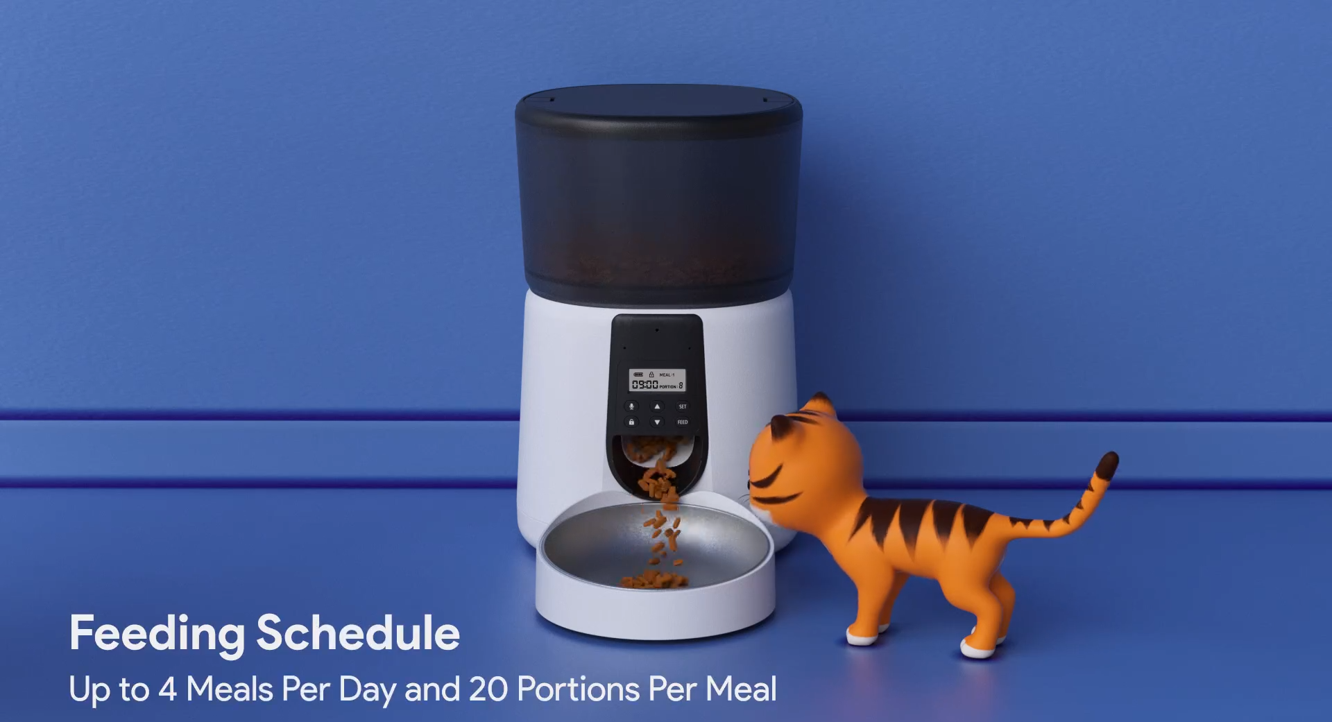 Scheduled Meal Management: With our automated cat feeders, you can program up to four meals in advance, providing your pet with up to 20 portions of customized food at designated times (14g ± 3g per portion).